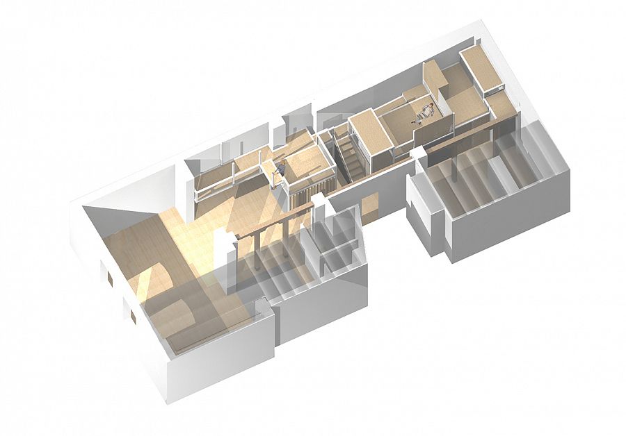 Встроенная многоуровневая окрашенная в белый цвет металлическая конструкция опирается на несущие стены из клинкерного кирпича. Горизонтальные низкоуровневые площадки, соединенные лестницами и переходами, сделаны из толстых сосновых досок, как и все полы в остальной части квартиры. Стены и разделительные перегородки встроенной структуры либо деревянные глухие, либо стеклянные прозрачные, либо полупрозрачные — все зависит от степени приватности конкретного помещения. Всего горизонтальных площадок после реконструкции насчитывается 10. В результате «на первом этаже» обустроены две спальни, две ванные комнаты, кухня и гостиная-столовая. На антресольных уровнях есть еще одна спальня и студия-галерея с системами хранения для книг.