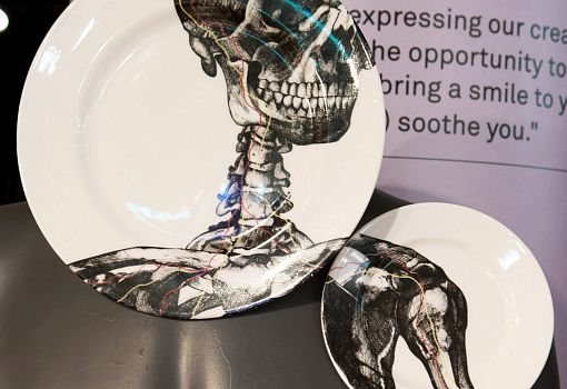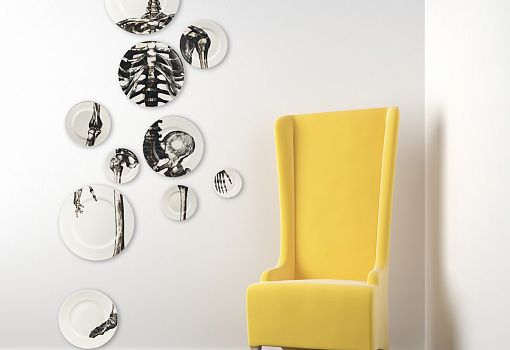 Фарфоровый сервиз Supermodel включает 10 тарелок (2 больших обеденных, 3 для завтрака и 5 пирожковых) с натуралистично изображенными фрагментами человеческого скелета. Для создания задуманного образа их нужно соответствующим образом расположить на стене (каждая тарелка имеет с обратной стороны крючок для подвешивания) или на столе – и скелет предстанет в весьма выразительном, хоть и не в полностью укомплектованном, виде.