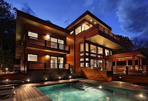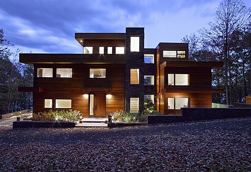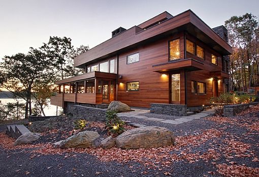 В архитектурной композиции дома от Foz Design, расположенного на берегу Гудзона (США), чувствуется привкус романтики и сдержанной роскоши. Деревянный дом имеет прямоугольную форму с выступами маленьких консолей. Площадь модернистского сооружения – 2 066 кв. м; здание отличается высокими потолками 6,1 метра. В интерьере преобладают натуральные материалы - дерево и камень.