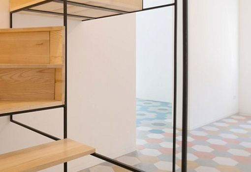 Лестница длиной почти 10 м проходит через зал по вертикали. Она состоит из дубовых досок и поддерживается структурой из уголков, сделанных из черного металла. Сетка 14-миллиметровых в сечении стержней обеспечивает устойчивость всей конструкции. «Когда вы думаете о Сицилии, почти невозможно не попасть в ловушку стереотипов», - сказал Либрицци. – «здесь весьма сильны зодческие традиции». В соответствии с ними архитектор, в частности, облицевал полы шестиугольной и треугольной плиткой.
