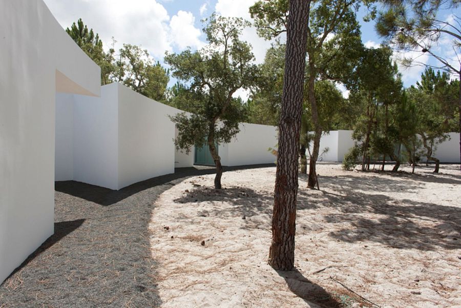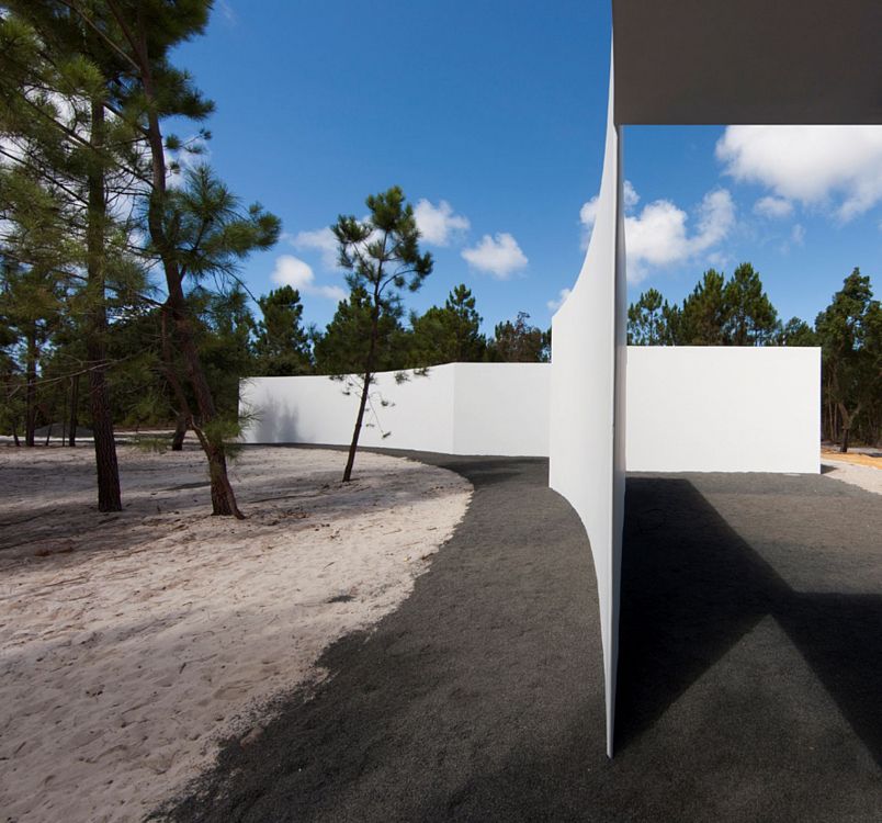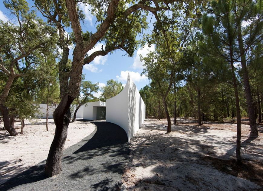 Минималистские скульптурные формы стали основой португальского проекта Аиреса Матеуша (Aires Mateus). Среди сосен каменного плато полукругом расположены белоснежные модули, ограничивающие внутренний двор. Для минимизации энергопотребления имеется большой бак для воды. Площадь дома 633 кв.м.