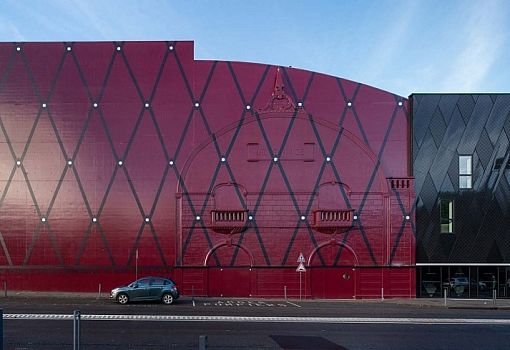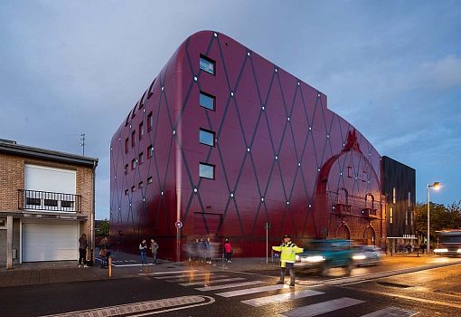 Конкурс на реконструкцию Бетюнского театра комедии прошел в 2009 году, однако реализован проект Manuelle Gautrand Architecture был только в прошлом году. Целью реконструкции стало увеличение площади, ремонт, а так же приведение культурного центра в соответствие с современными требованиями безопасности. Изменения коснулись как интерьера, так и экстерьера. Здание состоит из двух объемов разных форм. Округлый элемент символизирует прошлое театра (он претерпел минимальные изменения), а прямоугольный черный объем – это новая пристройка, дань современности. Обе части композиции «опутаны» ромбами; на красном фоне фасада сетка из черных геометрических фигур выглядит как решетка. Пристроенная часть отделана металлическими листами с похожей текстурой.