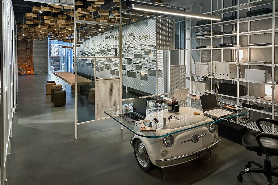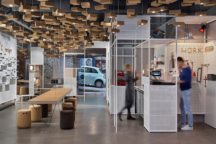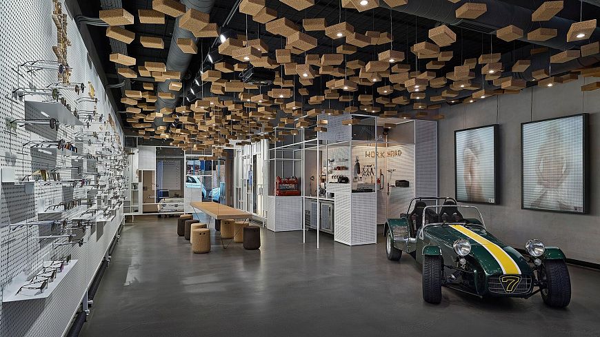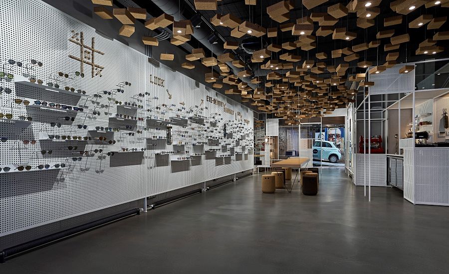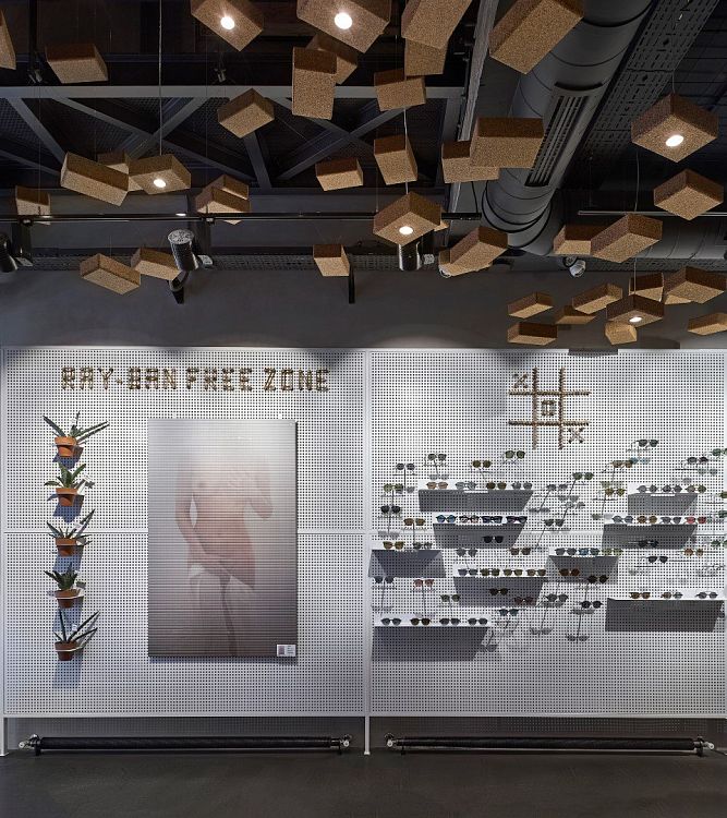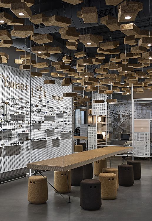 Торговое помещение находится на первом этаже здания, а двумя этажами выше – квартира владельца магазина. Она связана с торговым залом внутренним стеклянным лифтом. В качестве витрин для демонстрации очков дизайнеры использовали металлические перфорированные экраны. Йога-блоки из пробки, подвешенные к потолку (всего их 550 штук) выполняют функцию декоративных элементов. В некоторые из блоков вмонтированы светодиодные лампы. Кроме того, из пробкового дерева сделан и подвесной стол с расставленными вокруг него табуретами. Задачу «впустить улицу внутрь» авторы выполнили следующим образом: основа офисного стола в кабинете владельца представляет собой переднюю часть малолитражного автомобиля.