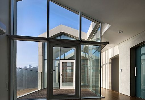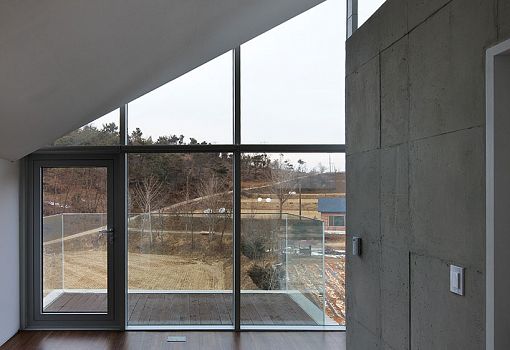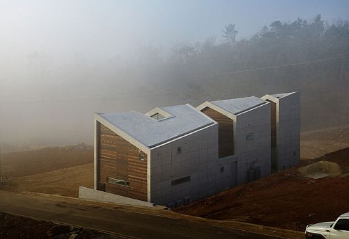 Именно на этом единстве строится образная концепция дома, построенного в Южной Корее бюро Аrchium. Он состоит из трех объемов со скошенными наклонными кровлями, объединенных патио и террасами. Благодаря этим проемам внутрь здание проникают солнечные лучи, а также осуществляется естественная вентиляция. Торцевые стены в местах соединения объемов отделаны темным деревом. Архитектурный облик усложнен стеклянными вставками и прозрачными балюстрадами. В интерьере взаимодействие бетона и дерева продолжается.