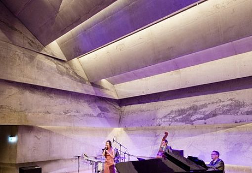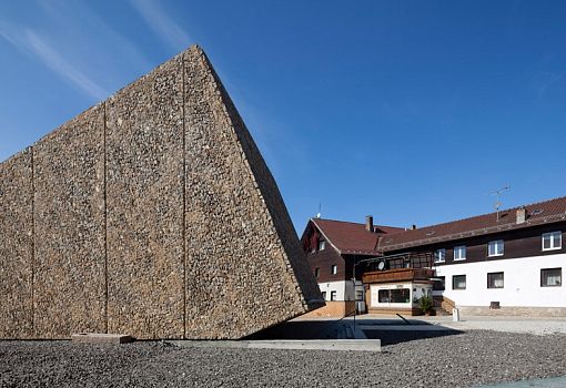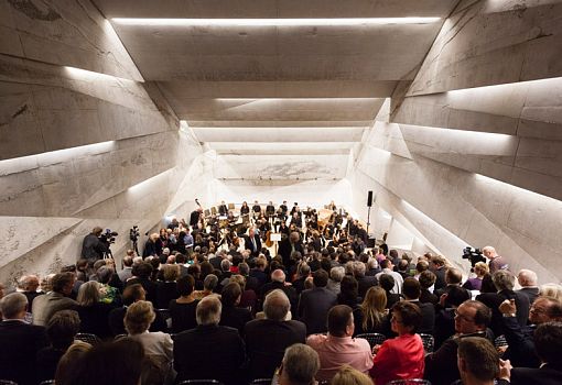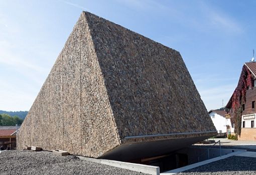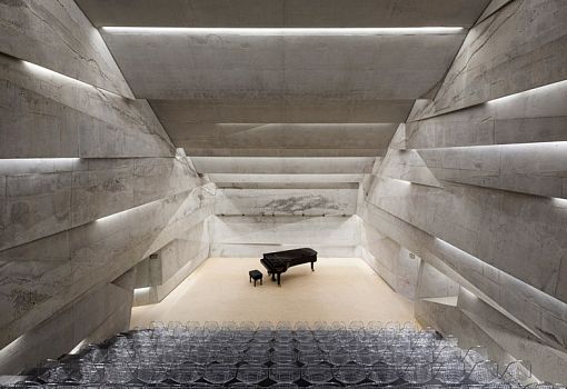 В баварской деревушке Блайбах (ФРГ) появился необычный концертный зал, созданный архитектором Питером Хаймерлем. Фасады здания облицованы грубым камнем, а стены изнутри – бетонные, неотделанные. Объем частично заглублен в землю. Главный зал представляет собой пространство, словно бы сформированное сложенными друг на друга мегалитами. Искусная подсветка имитирует полоски света, проникающие в пещеру сквозь разломы в породе. По мнению авторов, такой дизайн и декор улучшают акустические характеристики помещения.