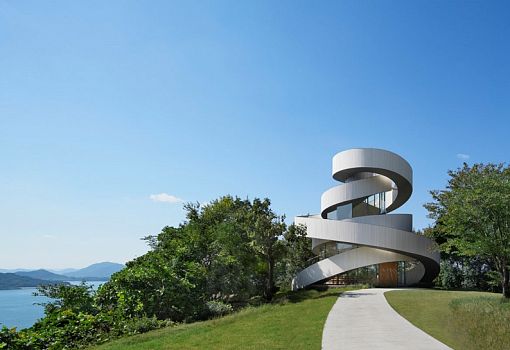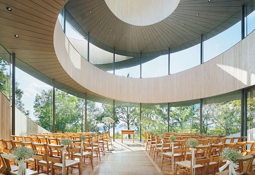 По проекту архитектора Хироши Накамуры на территории одного из курортов Японии построена небольшая свадебная часовня. Выполнена она в виде двойной спирали, образованной из двух лестниц, символизирующих жизненные пути влюбленных, начинающиеся порознь и затем соединяющиеся. Строение поднято над деревьями, и со смотровой площадки открывается удивительный вид на море. Стеклянная крыша и окна между лестницами объединяют внутреннее пространство с окружающей средой и минимизируют зависимость от искусственного освещения.
