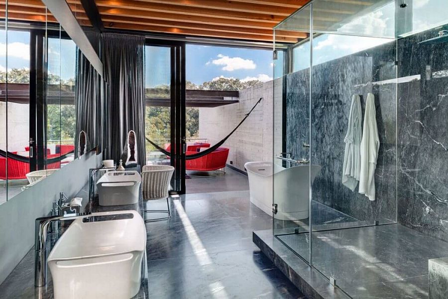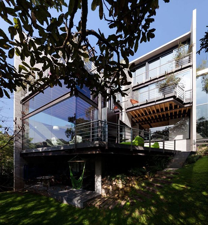 Основой концепции дома La Casa en el Bosque в Мехико (Мексика) стали открытые пространства, визуальная легкость и выразительные панорамные виды. Два объема, объединенные стальными лестницами, щедро остеклены, что создает ощущение высоты и открытости пространств.