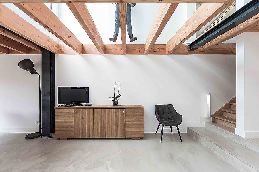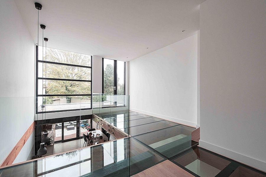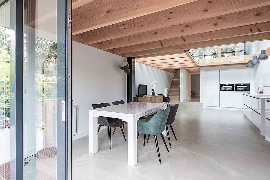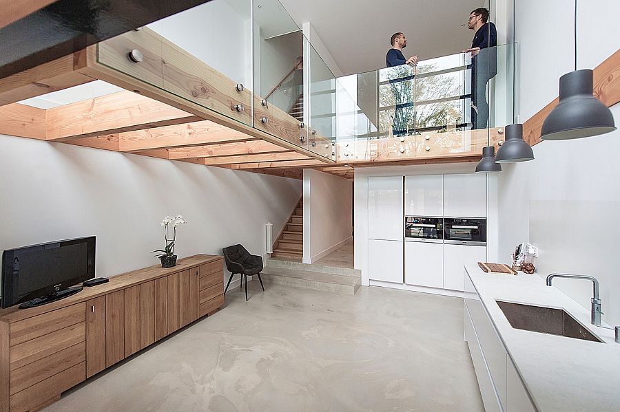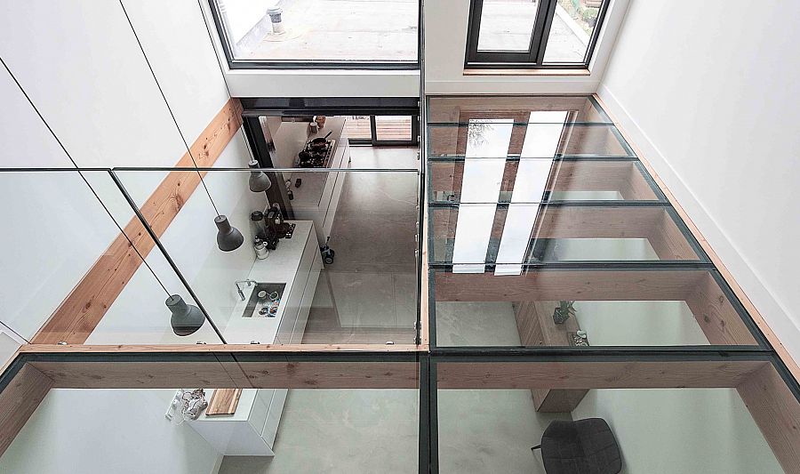 Архитекторы BLOOT расширили цоколь и обустроили там семейную кухню с видом на сад. Кухня связана с открытой просторной верандой. Межэтажное перекрытие между цокольным этажом и первым, где запроектирована гостиная, сделано из толстого закаленного стекла, уложенного на деревянные балки. Это был самый радикальный прием в проекте, использованный архитекторами. Благодаря этому ходу все гостевые помещения визуально объединились: кухня, гостиная, веранда и кровельная терраса на пристройке.