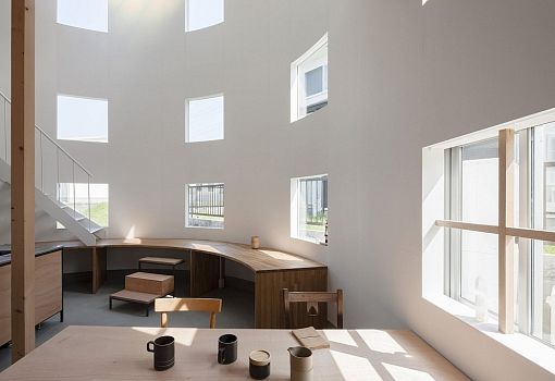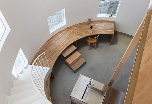 Дом в Хиконе (Япония) от архитекторов Tato Architects стал отличным дополнением городских пространств. В общем виде сооружение представляет собой объем с 42 окнами, при этом предназначается двухэтажное жилище для одной молодой пары. Помимо неординарного архитектурного решения авторы использовали определенные новации в интерьере. Так, стол трансформируется в лестницу: деревянная конструкция высотой 75 см опоясывает полукруглую стену и плавно переходит в винтовую лестницу.