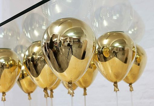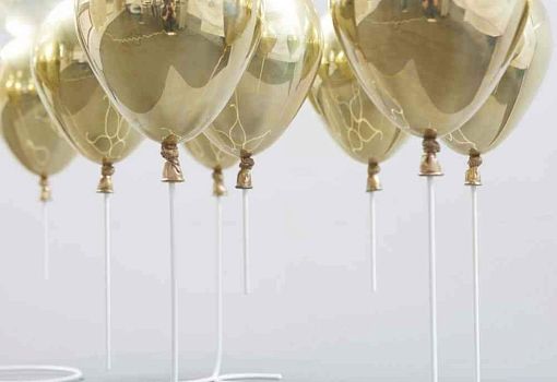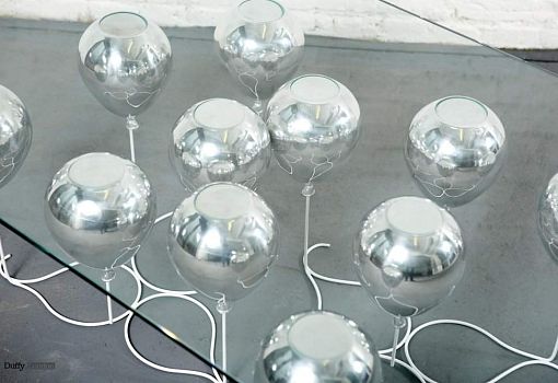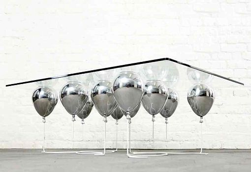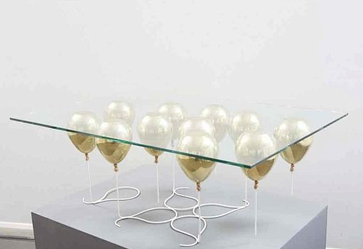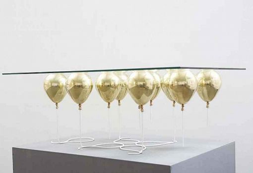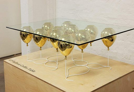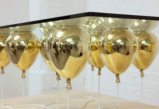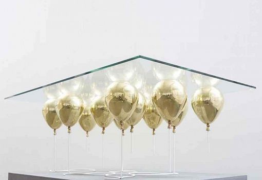 Журнальный стол UP – «парящая» на высоте 40 см прозрачная столешница, поддерживаемая снизу золотыми или серебряными воздушными шарами. Материалы: закаленное стекло, металлополимерный композит, стальные стержни. Выпускается ограниченной серией.