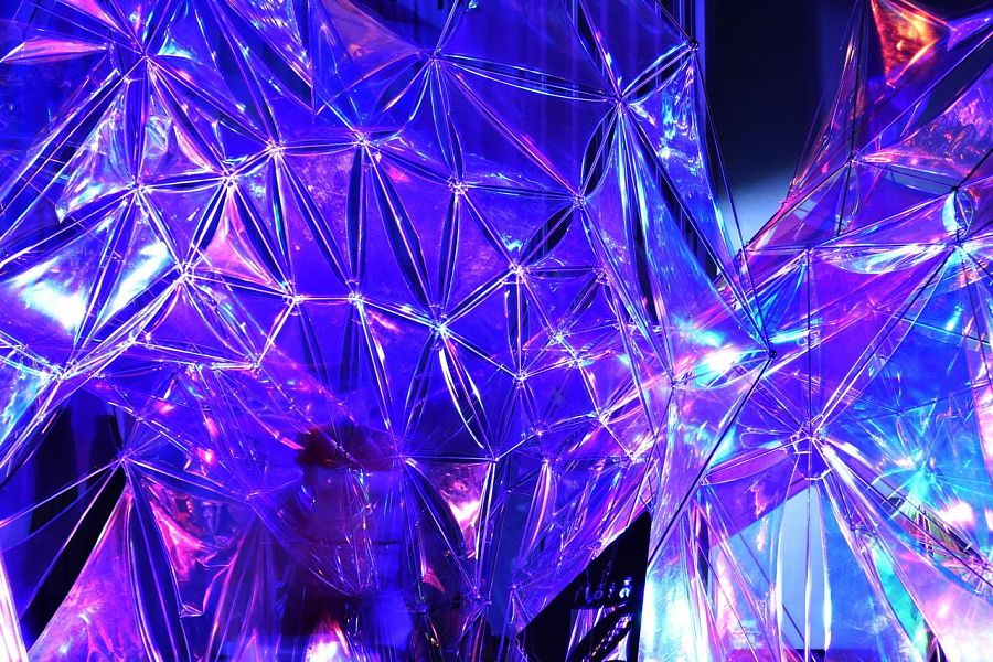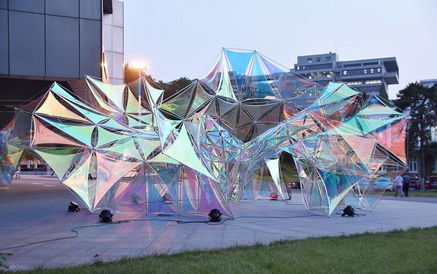 Оно состоит из 703 нержавеющих трубок разной длины и 272 металлических шаров, которые используются в качестве крепежных узлов. Пространство между ребрами жесткости затянуто прозрачной пленкой ПВХ. «Картинка», открывающаяся перед глазами посетителя, находящегося внутри павильона, всякий раз разная: все зависит от угла зрения, времени суток и погодных условий.