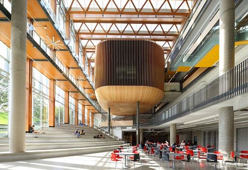 В Ванкувере (Канада) архитекторы бюро B+H реализуют проект студенческого центра. Рендеры проекта AMS Student Nest демонстрируют своеобразную концепцию с элементами промышленного стиля. Неординарные решения есть как в архитектуре, так и в интерьере будущего здания. Чего стоит хотя бы антресольный объем из дерева, расположенный на опорах в атриуме.