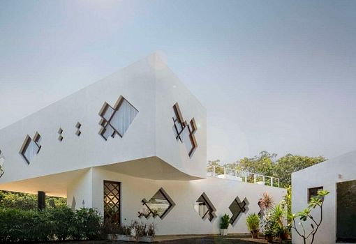 Вилла Tomoe, расположенная в Алибаге (Индия), привлекает внимание своей неординарностью. Сооружение из нескольких прямоугольных объемов, стоящих под углами относительно друг к другу, закручивается подобно спирали: так формируется жилое пространство, террасы и внутренний двор. Здание интегрировано в ландшафт довольно удачно, например, склон естественного холма защищает дом от наводнений.