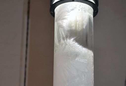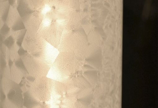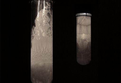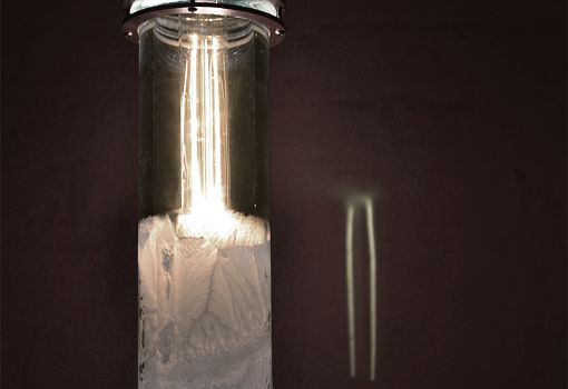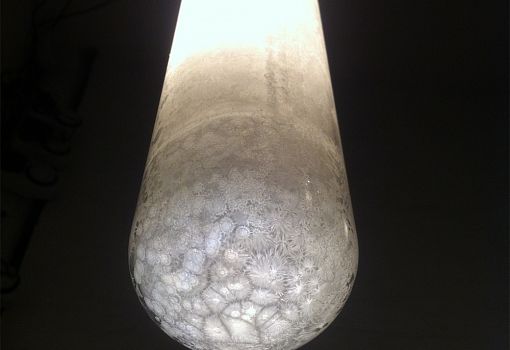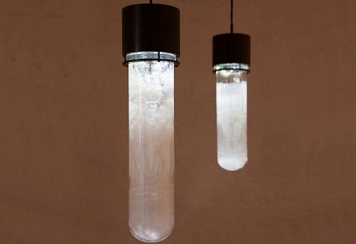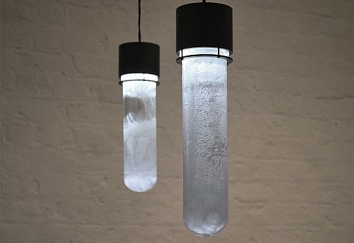 Идею для коллекции молодым дизайнерам подсказали разукрашенные морозными узорами зимние окна. Внутреннюю поверхность плафонов из выдувного стекла покрывает кристаллизующееся белое вещество. Когда лампа включена, ее внешний вид постепенно меняется: узоры вблизи нагревшегося источника света начинают «таять», и стекло постепенно становится прозрачным. После выключения светильника субстанция остывает и снова кристаллизуется, образуя характерные узоры.
