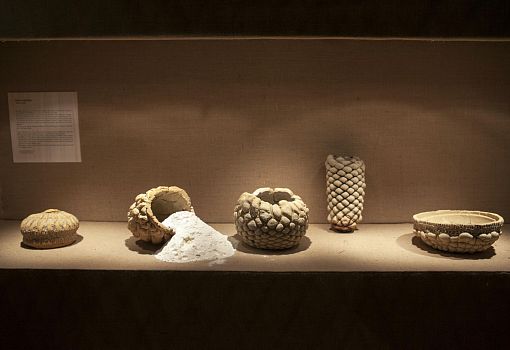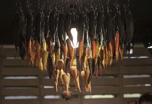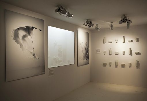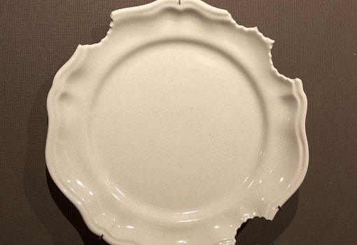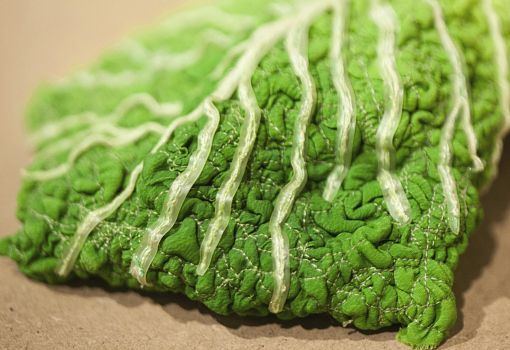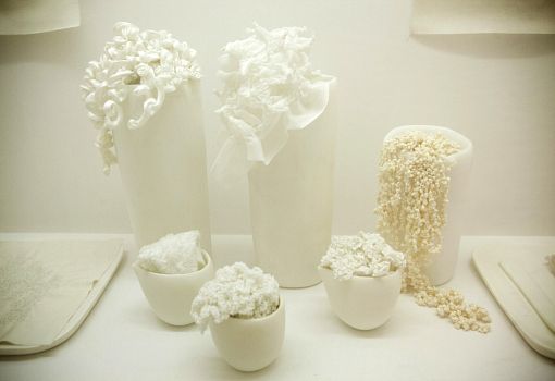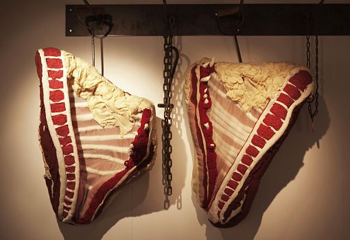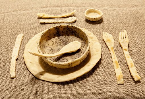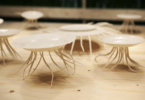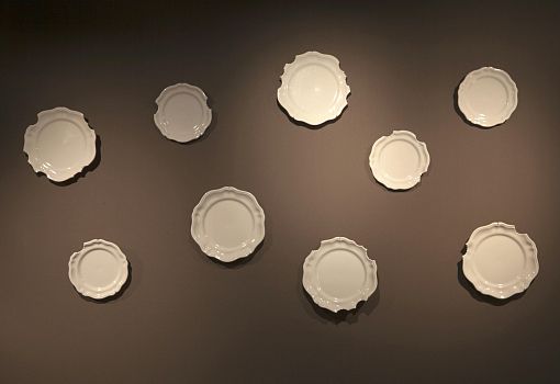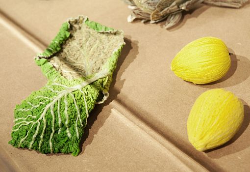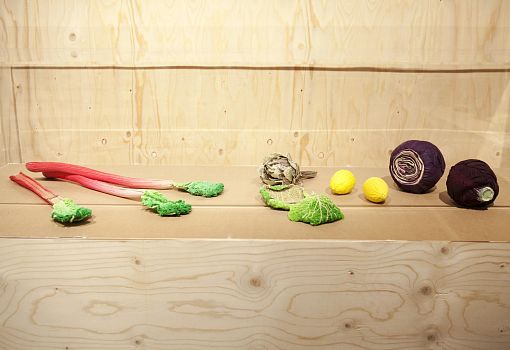 Инсталляция эта полна неожиданностей. С первыми – и самими масштабными из них – знакомишься еще на подходе к объекту: перед нами ламельная стена, собранная из подвешенных багетов, и еще одна ламельная стена, составленная из длинных ящиков с зелеными ростками. Внутри сюрпризы продолжаются: люстра из корнеплодов, люстра из кристаллов соли; миски и блюда, слепленные и из смеси воды, муки и песка; полная столовая сервировка из муки и воды (выпеченные тарелки, столовые приборы и даже «салфетки»). Ваза из натурального воска и имитирующий натуральный воск плафон светильника. Художественные изделия из ткани, имитирующие молоко, и молоко в движении, запечатленное на арт-фото. Мясная «расчлененка» в виде посуды, керамических скульптур-аксессуаров, и текстильных арт-объектов. Сшитые овощи, которые отличимы от настоящих только на расстоянии нескольких сантиметров. И – как апофеоз – тарелки с «обкусанными» краями.