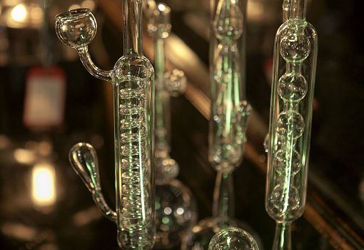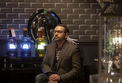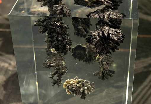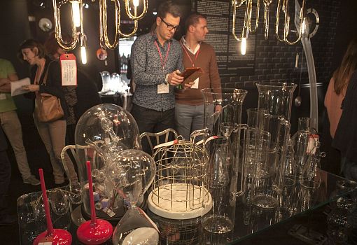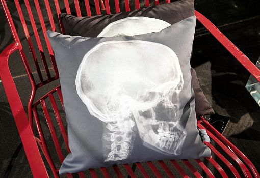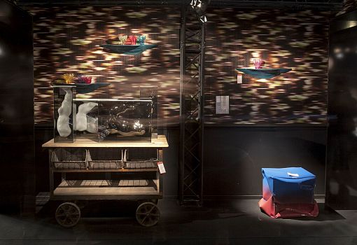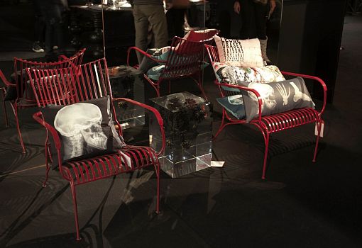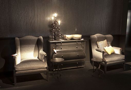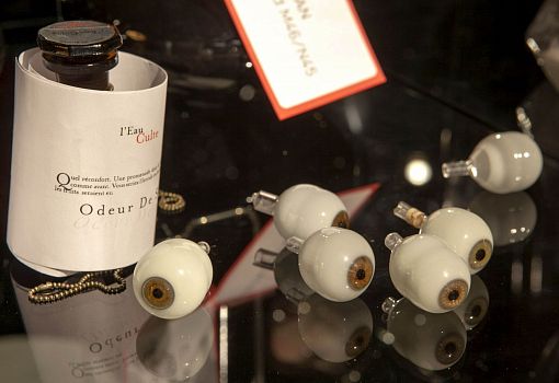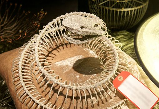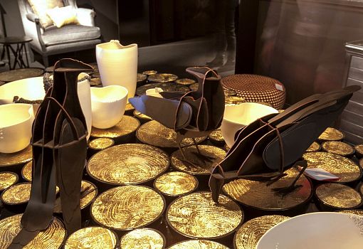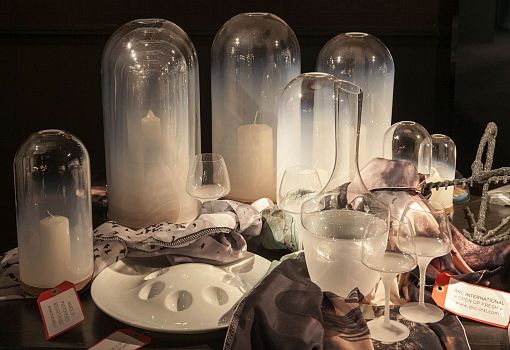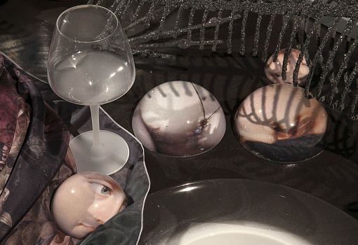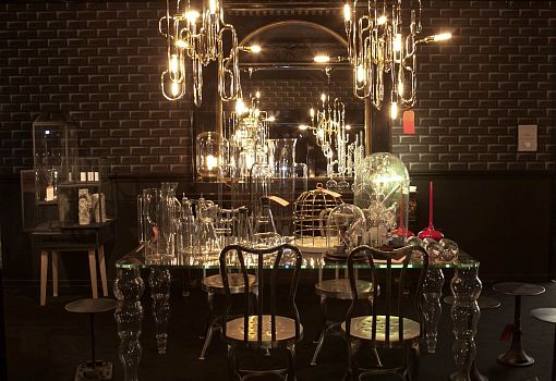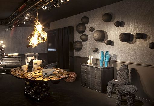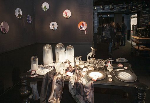 Научный (и псевдонаучный) экспириенс временного диапазона от эпохи Возрождения до наших дней устраивает полный разгул в интерьере. Колбы, реторты, пробирки, змеевики и прочий лабораторный антураж обнаруживается не только среди посуды и аксессуаров, но и в виде крупной формы – люстр и даже частей мебели (стеклянные выдувные ножки стола). Принты-рентгенограммы на текстиле и инвертированные фотоизображения на тарелках. Часы, маскирующиеся под старинные приборы, и стулья, маскирующиеся под молекулярные цепи. Пугающие своим содержимым увеличительные стекла. В интерьере этой инсталляции много от кунсткамеры: стеклянные колпаки, скелеты, «заспиртованные» в прозрачном акриле шишки, анатомические фрагменты (как вам флаконы – глазные яблоки? а молочная железа на блюдце?) и т.п. Вся эта фантасмагория вдобавок приправлена щедрой порцией мрачного готического антуража (эта тема по-прежнему в фаворе у интерьерного дизайна): разнообразные по фактуре, но всегда черные покрытия стен, черный пол, черная мебель и инфернальные вороны, вольготно пирующие на золотом столе.