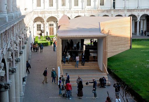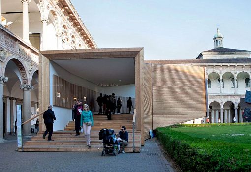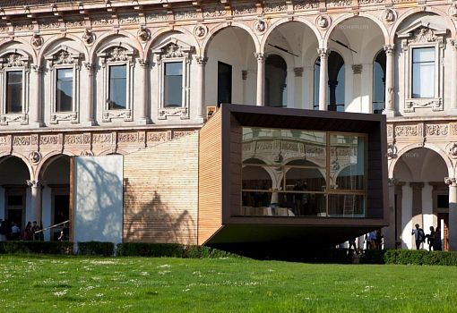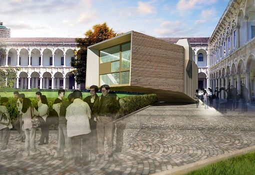 Выстроенный во дворе миланского Университета дом «The View» Луки Скаккетти (Luca Scacchetti) представляет собой своеобразный изогнутый полый «тоннель», который одним концом опирается на землю, а другим зависает на высоте полутора метров от земли. Длина «трубы» - 16 метров, в ширину она имеет  5 метров на нижнем конце и постепенно расширяется до 8, заканчиваясь впечатляющим «раструбом» -  фасадом с панорамным остеклением. Автор сравнивает свой объект с телескопом – и формально (изогнутая труба со стеклянным концом), и метафорически: The View – это вид на архитектуру завтрашнего дня, главные ценности которой – экологичность, надежность, долговременность, рисайклинг.