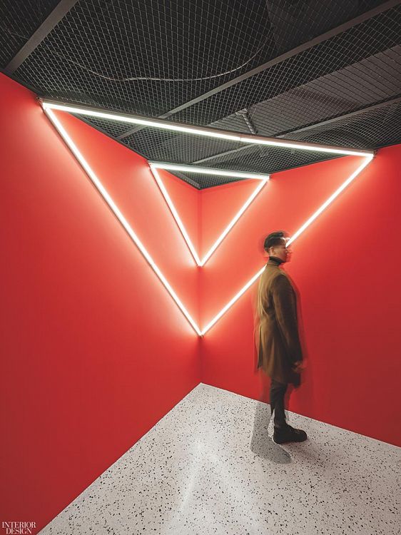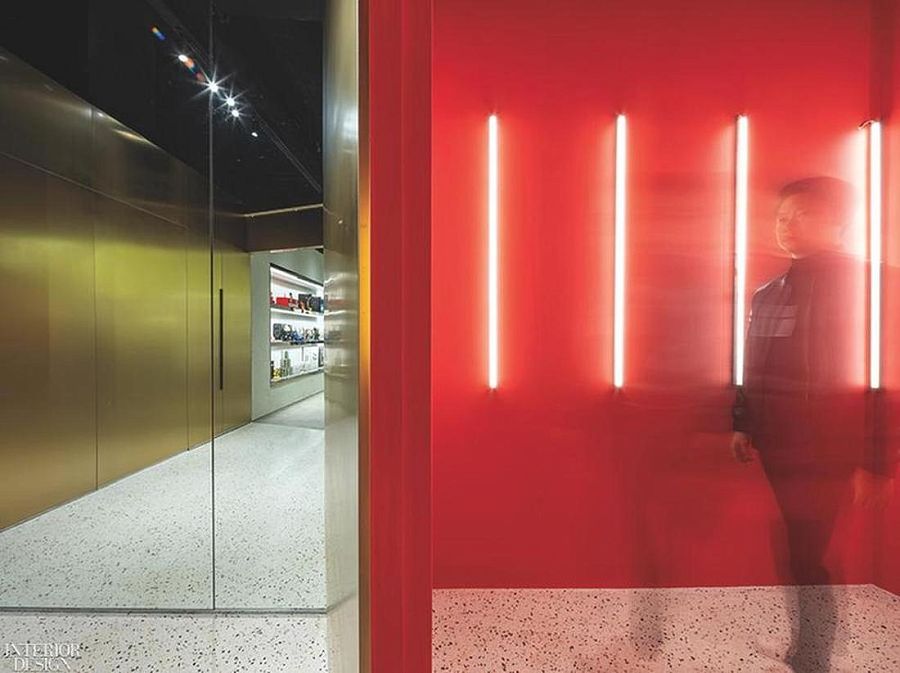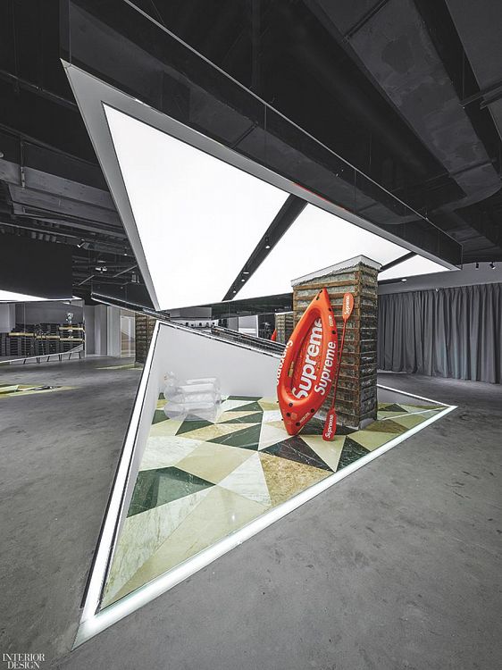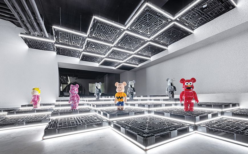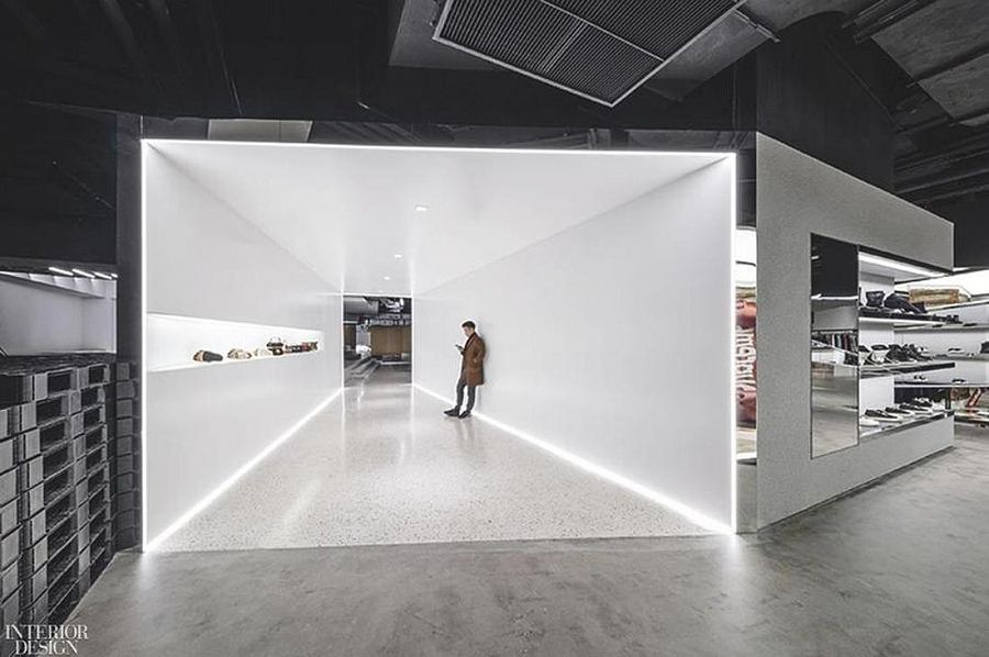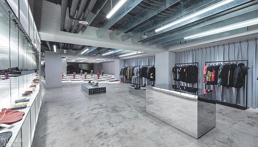 Магазин площадью около 900 кв.м расположен на подземном этаже в большом шанхайском торговом центре. Авторы проекта решили обыграть в дизайне особенности помещения. К примеру, разветвления воздуховодов на потолке воспринимаются как элемент индустриальной эстетики. Из бетонного пояса высотой более 1 м, идущего по периметру торгового зала, архитекторы сделали скамью, выполняющую также функцию витрины. Передняя часть торгового зала с колоннами представляет собой кластер треугольных напольных «островных» витрин со светодиодной подсветкой. Угловые части «островов» отполированы до зеркального блеска. Это элемент «продающей» стратегии: покупатель не в состоянии издалека разглядеть многократно отражающийся в зеркальных поверхностях товар, поэтому он подходит ближе и рассматривает вещь более внимательно. «Напольные витрины годятся для презентации чего угодно — модной одежды, мебели, коллекционных игрушек, скульптур», - поясняют авторы проекта. И действительно, на входе покупателей встречают японские игрушки из серии Bearbrics. Основной материал проекта — камень терраццо. Из него, например, сделан прилавок, больше напоминающий стойку бара, а также несколько кассовых столов в глубине зала. Пол также собран из плиток терраццо с медными вставками.