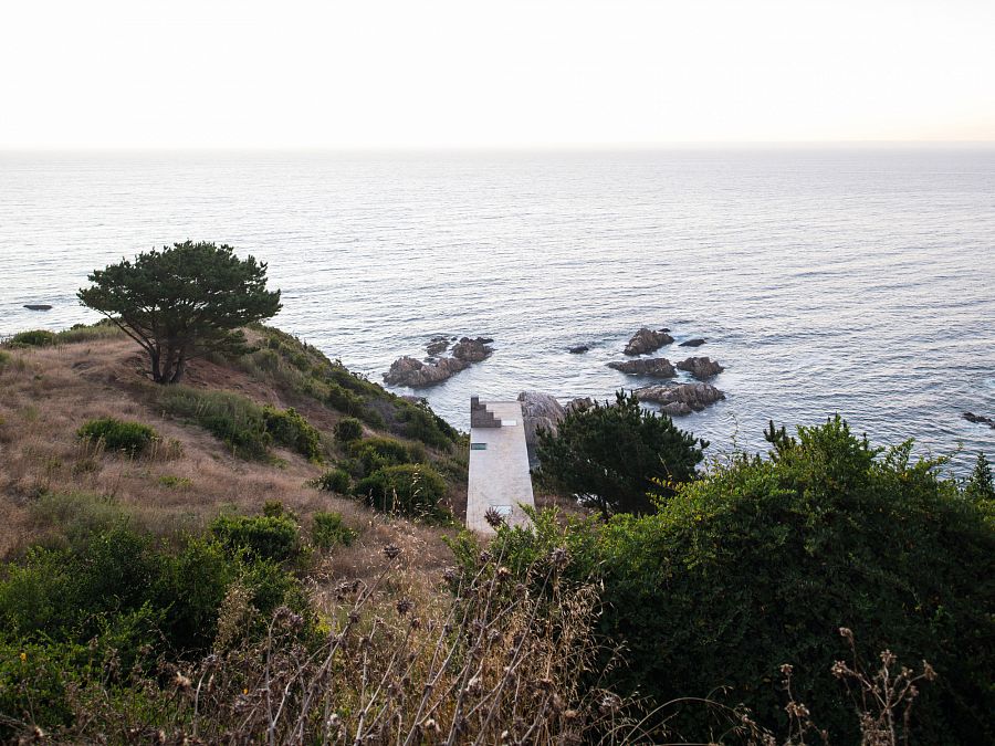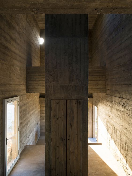 И это действительно так, ведь в Loba House нет даже отделки, только необработанный бетон в следах опалубки. Зато из окон открываются замечательные виды на океан. Размер пятна застройки – 3,2х19,2 м, то есть, параллелипипед здания сильно вытянут в длину. Здание общей площадью около 70 кв.м владельцы используют в качестве загородного дома. Конструктивная основа постройки – шесть бетонных платформ, которые, подобно ступеням гигантской лестницы, спускаются вниз по склону холма. Внутренних перегородок нет, в интерьере можно заметить только колонны, визуально разграничивающие отдельные зоны. На кровле обустроена терраса. В доме запроектированы такие помещения, как гостиная, кухня, столовая, ванная комната и спальня. Встроенные системы хранения способствуют сохранению «минималистского» статуса интерьера. Гостевая спальня расположена на антресоли, опирающейся на потолочные балки. Дневной свет попадает внутрь бетонного дома благодаря люкам и стеклянным дверям.