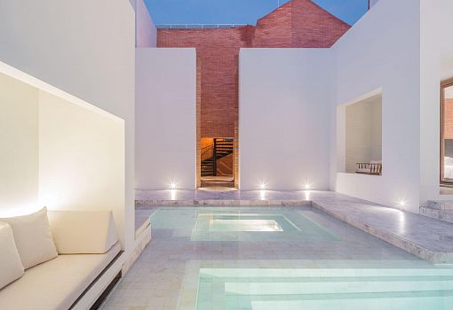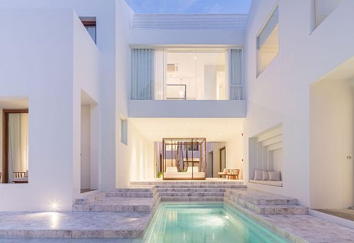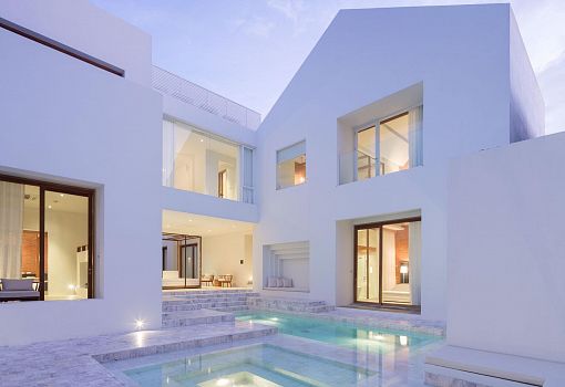 Монохромная минималистская композиция – это отель SALA AYUTTHAYA от архитекторов Onion. Сооружение расположено в самом живописном районе старой столицы Тайланда на берегу реки Менам-Чао-Прая. В архитектуре просматриваются традиционные мотивы в виде фигурной кирпичной кладки, железных дверей и оригинальных деревянных потолочных конструкций. Геометрия белоснежных фасадов и мраморных бассейнов контрастирует с волнообразными изгибами главного портала.