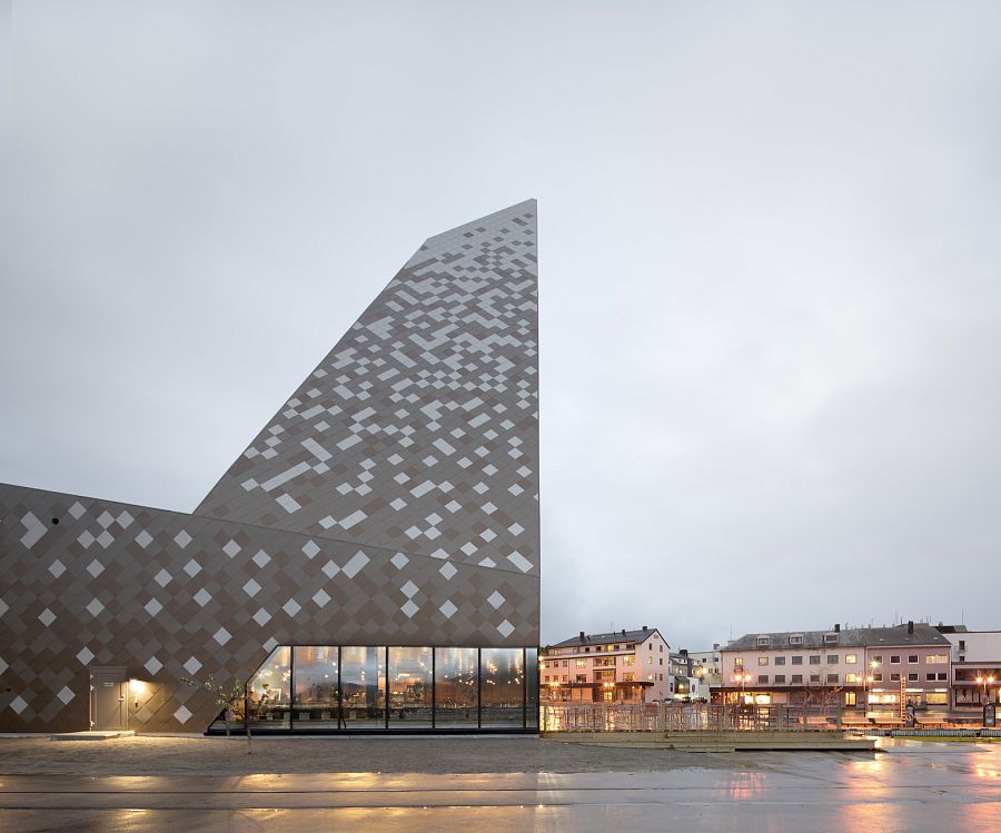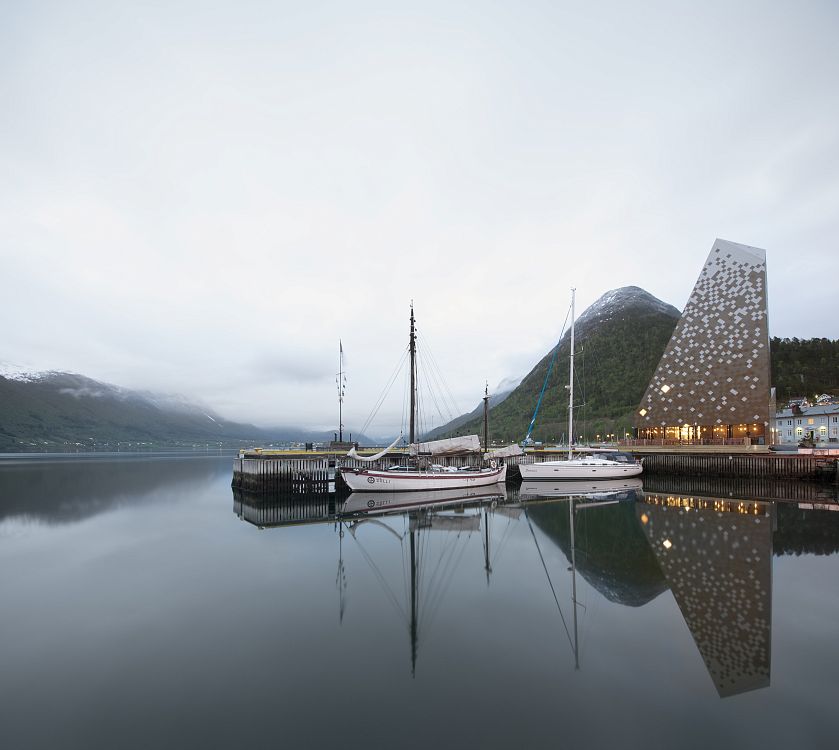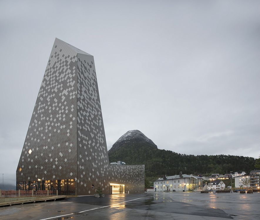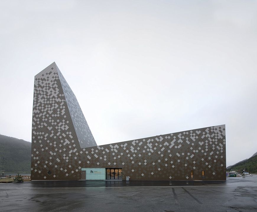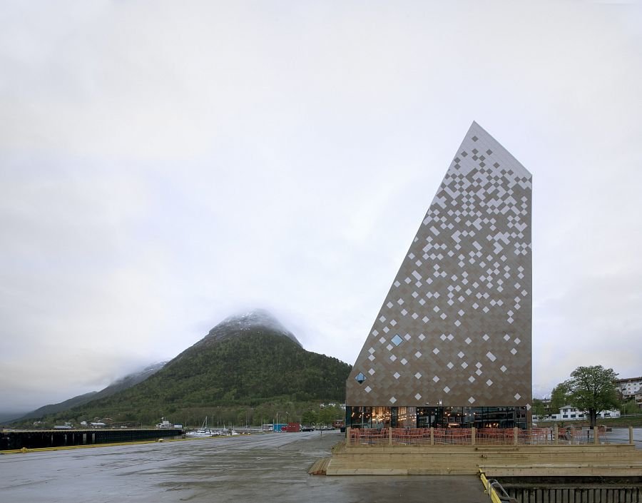 Здание центра альпинизма в Ондалснесе (Норвегия) разработанное фирмой Reiulf Ramstad Arkitekter, облицовано белой, серой и коричневой плиткой. Плотность белых плиток возрастает по направлению к верхней части здания, создавая впечатление заснеженной горной вершины.