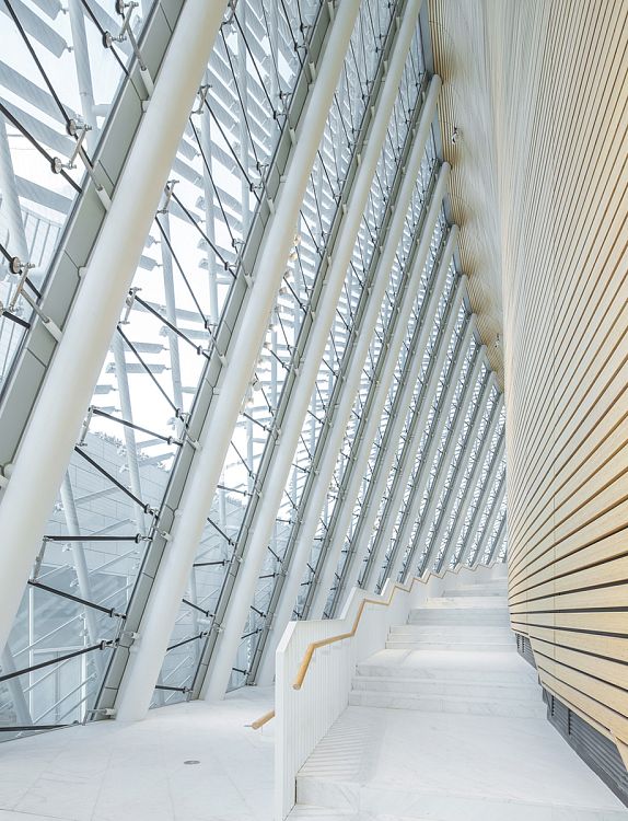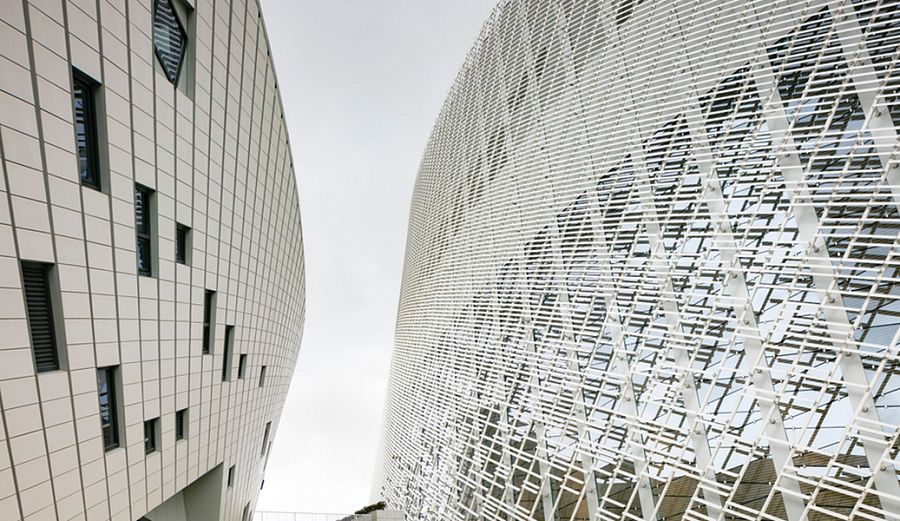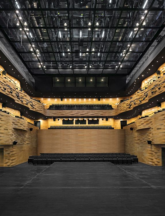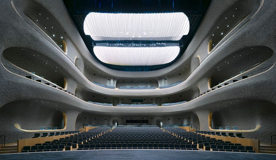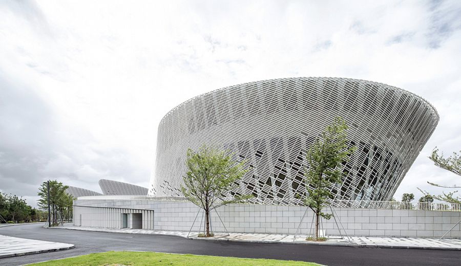 В основе пространственной композиции комплекса лежит традиционный образ цветущего жасмина. Пять архитектурных объемов – это оперный зал, концертный зал, многофункциональный театр, выставочный центр и киноцентр. Все они облицованы белой керамической плиткой. Кроме этого материала в проекте были использованы усиленный стекловолокном бетон, сталь, мрамор и древесина бамбука. Фасады культурного центра оборудованы солнцезащитными экранами длиной около 2 м каждый, причем угол поворота этих плоскостей высчитывался при помощи специально разработанной компьютерной программы. Так разработчики постарались избежать перегрева помещений. Любопытная деталь: для пространства театра была придумана внутренняя оболочка из бамбуковых плит, вырезанных на машинах с ЧПУ. На предварительных испытаниях бамбук продемонстрировал отличные акустические качества.