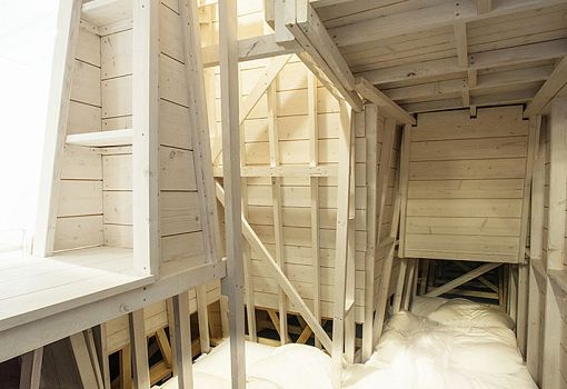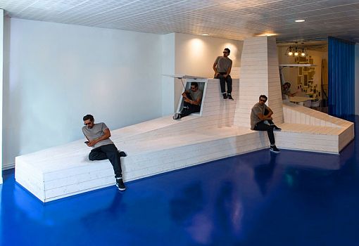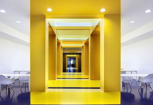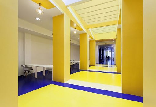 Стены из ПВХ служат в качестве перегородок, обеспечивая термическую и акустическую изоляцию, в то время как в качестве основных цветов выбраны сочетания синего и желтого. По мнению авторов, они создают идеальную рабочую атмосферу.
