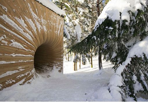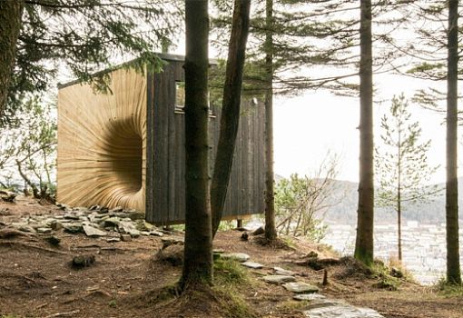 Норвежские студенты одной архитектурной школы под руководством архитектора Эспена Фольгеро (OPA Form architects) создали Tubakuba – деревянный домик, расположенный в Бергене (Норвегия) на склоне горы. Он представляет собой куб с фантастического вида входом, похожим на дверь в другое измерение. Сооружение отделано снаружи натуральным деревом, причем каждый фасад – особенный. Одна из стен покрыта обожженной древесиной по японской технике, другая – необработанной лиственницей, цвет которой сольется со временем с окружающими природными объектами.
