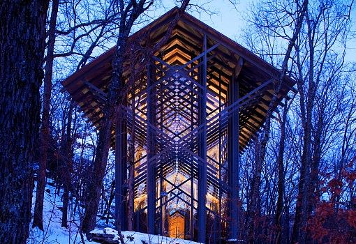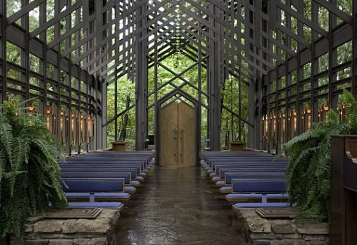 В этом году празднует свое 35-летие часовня Thorncrown – детище архитектора Фэя Джонса, протеже Фрэнка Ллойда Райта. Сооружение кажется частью нетипичного для Арканзаса пейзажа. Причудливое неоготическое строение отличается небольшой площадью – 440 кв. м, которая визуально увеличивается за счет 15-м высоты и полному остеклению (всего 1800 кв.м.) фасадов.