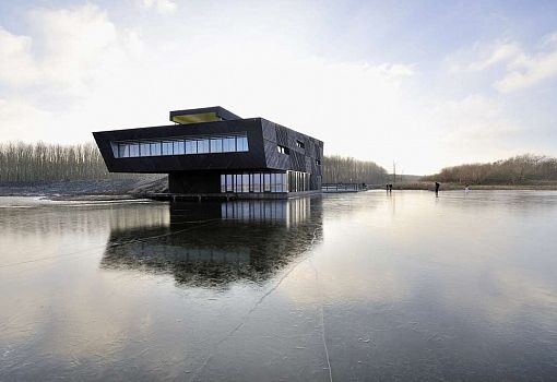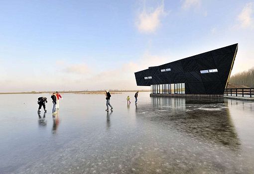 Нидерландский центр De Oostvarders гармонично вписан в природный ландшафт. Объект бюро Drost + van Veen architecten притягивает к себе внимание благодаря форме и контрасту с окружением. Восприятие геометрии объема меняется в зависимости от угла зрения. Для отделки фасадов использована сосна. В многофункциональном сооружении находятся классы, конференц-зал, ресторан и информационная комната.