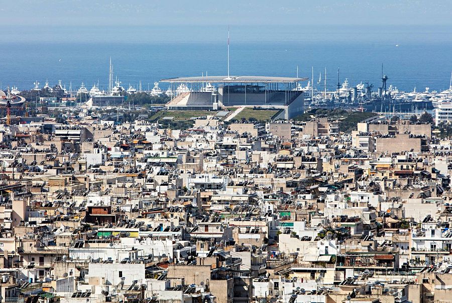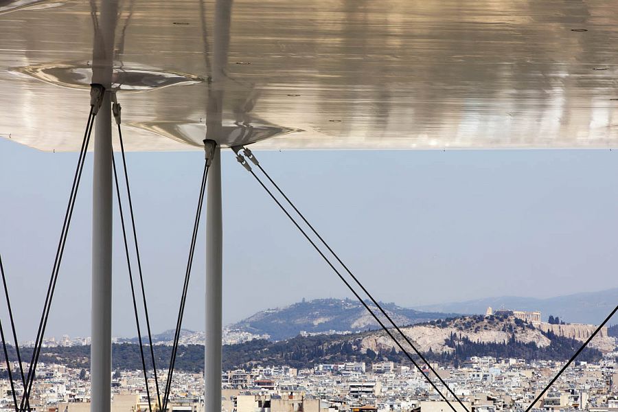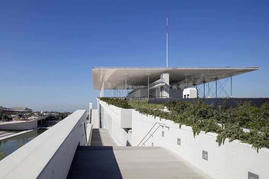 Изогнутая как крыло самолета, она изготовлена из армированного бетона, укрепленного тонкой стальной сеткой, и поддерживается умной системой подвески, что позволяет изгибаться, а не ломаться в случае землетрясения. Здание возведено на искусственном холме, что обеспечивает великолепный вид на море. В новом культурном центре, окруженном ландшафтным парком, разместились Национальная библиотека и Национальная опера Греции, однако, из-за экономического кризиса в стране книжные полки стоят пустые, а будущее финансирование проекта остается неопределенным. «Оперное» крыло отделено от библиотеки традиционной греческой агорой. В опере два зала на 450 и 1400 мест. Библиотека – это не только место для изучения и сохранения культуры, но и общественный ресурс, пространство, где культура становится действительно доступной. Все помещения здесь имеют прозрачные стены, а читальный зал расположен прямо под навесом крыши, оснащенной фотогальваническими элементами. Вдоль пешеходной дорожки проложен водный канал.