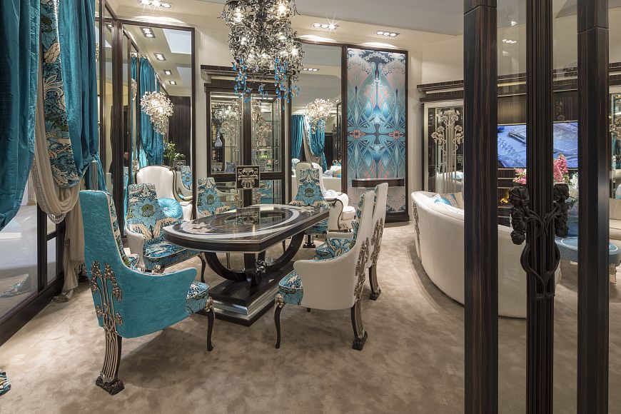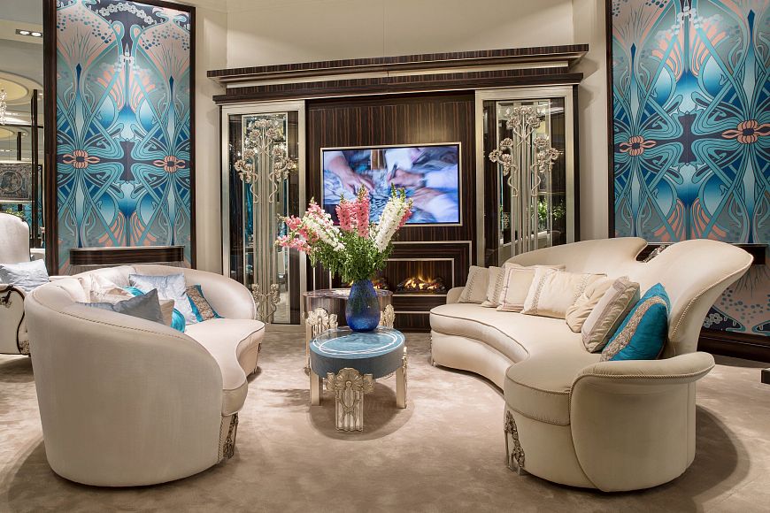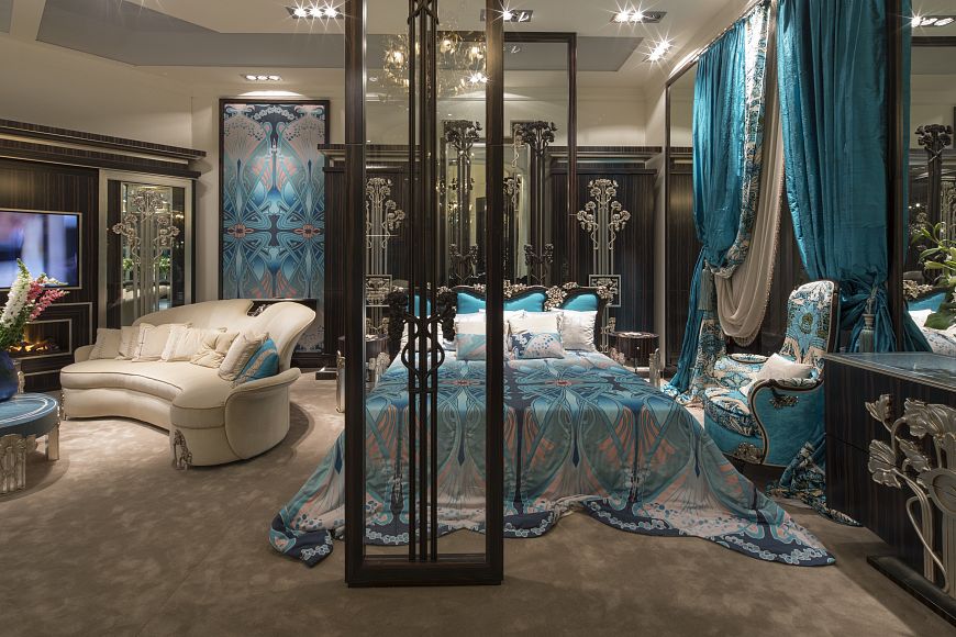 Яркая, стильная, жизнерадостная коллекция в стиле ар-нуво представляет сразу несколько направлений: это и мебель из уникальных пород дерева с использованием редкой техники интарсии и ручной резьбы , это высококачественные ткани с авторским принтом, это и лимитированная коллекция люстр с чистейшими кристаллами Swarovski и, конечно, уникальные 3,5 метровые двери с инкрустацией пяти оттенков перламутра.