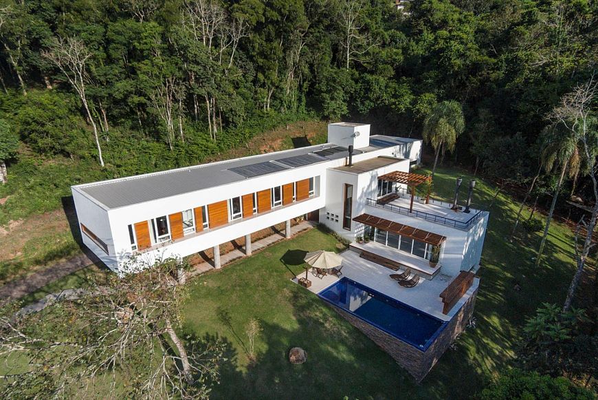 В результате композиция напоминает букву Т. Площадь здания составляет 510 кв.м. Важная деталь реализации проекта: ландшафт участка практически не тронут, постройка органично интегрирована в природную среду.
