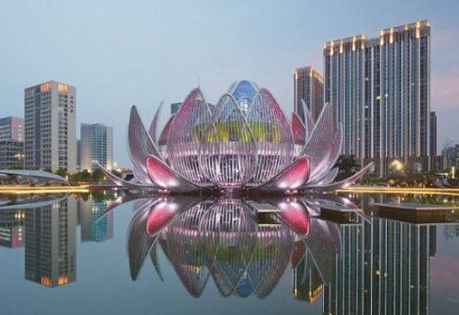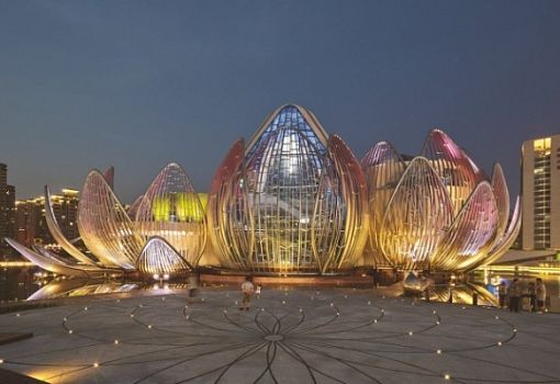 В мире появился еще один образец символической архитектуры: хрупкую красоту и изящество цветка лотоса решили увековечить архитекторы и дизайнеры бюро Studio505 в своем Lotus Building. Сооружение расположено на водной глади искусственного озера в Вудзине (КНР). Фасад «лотоса» оборудован светодиодной подсветкой, сценарии которой меняются каждые 20 секунд.