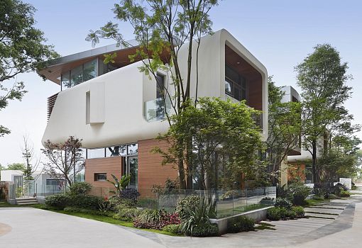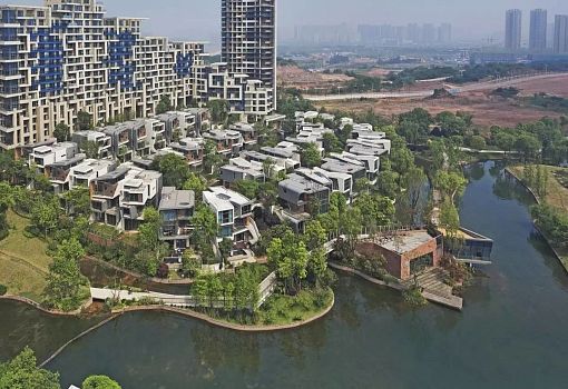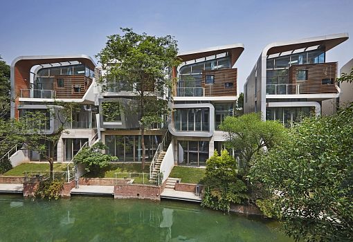 В разрез со сложившимися традициями пошли проектировщики в Китае. Для планирования района с семейными особняками было привлечено бюро John Friedman Alice Kimm Architects (JFAK). На берегу озера веером расположились домики, в которых отражена эстетика, традиции Востока и отношение китайцев к природе. В каждом доме три этажа, где присутствуют общественные и частные зоны. Выполнены строения из бетона с металлическими, деревянными, каменными и стеклянными элементами. Успех проекта безусловный – все 43 единицы были проданы за один день еще до завершения строительства.