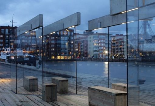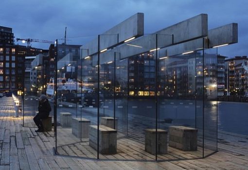 На западном побережье Швеции (Гетеборг) находится старый полузаброшенный пирс, который решили преобразовать в общественное пространство. Недавно на пирсе появились ветрозащитные павильоны дизайнеров Даниэля Эллиса Карлссона и Паулины Ольгерёд. Проект называется Bärande Möte. Это минималистские изящные конструкции из стекла, дерева и бетона. Смотрятся эти сооружения весьма брутально и подчеркивают индустриальное прошлое этого участка.