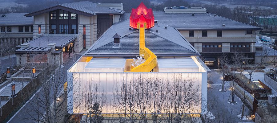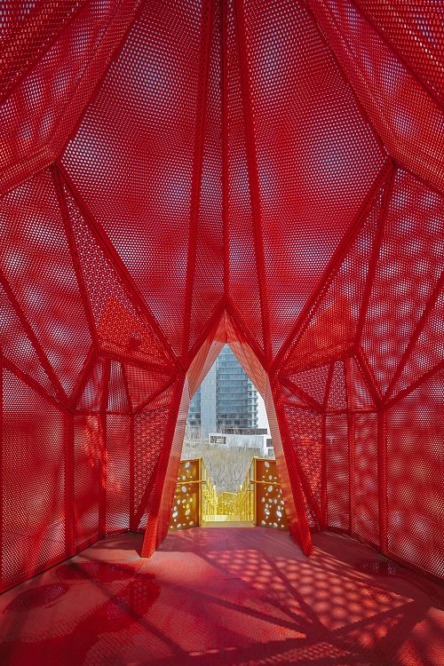 Дверь из ресторана ведет в так называемый "Лес света" - внутренний двор, огражденный стенами из поликарбоната. Здесь растет всего одно дерево, но зато какое! Кажется, что ветви его увешаны шарами с молочным туманом или экзотическими плодами. Именно отсюда начинается восхождение на кровельный павильон.