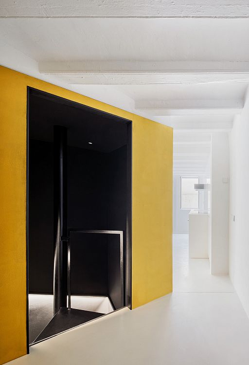 Самые примечательные элементы интерьера - это цветные прямоугольные объемы, развернутые относительно вертикальной оси. Внутри одного из них запроектирована лестница, а в другом обустроена спальня. Выбранное колористическое решение подчеркивает изящество геометрии обновленного пространства. Снаружи объемы выкрашены блестящей золотой, а внутри - черной краской. Этот контраст и стал основным дизайнерским приемом.