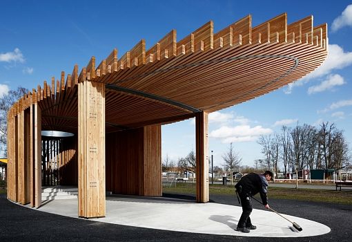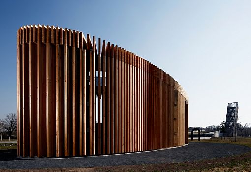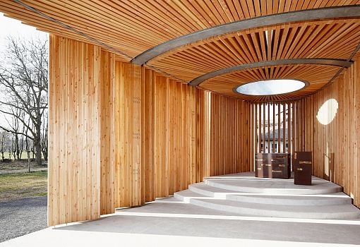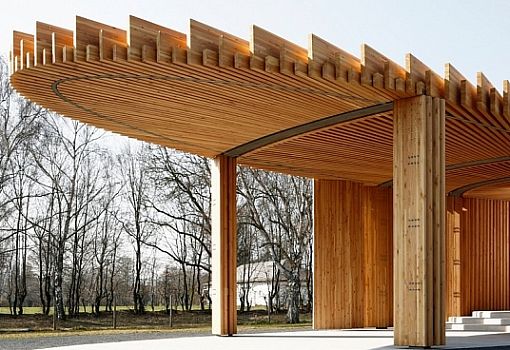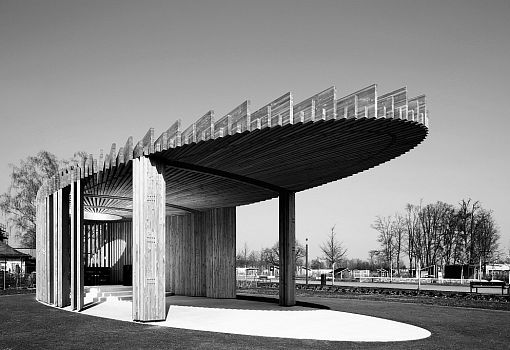 Проектируя церковные пространства, сложно добиться нужной атмосферы. Однако бюро Вayer Uhrig Architekten, похоже, это удалось. Архитекторы разработали открытый временный павильон в Ландау-ин-дер-Пфальц, в котором священную атмосферу помогает создать игра света, проникающего через пластинчатые боковые стенки.