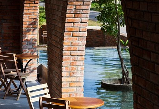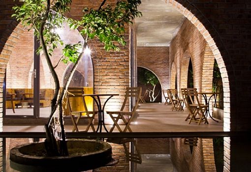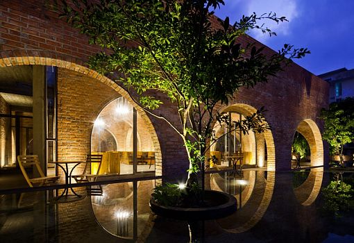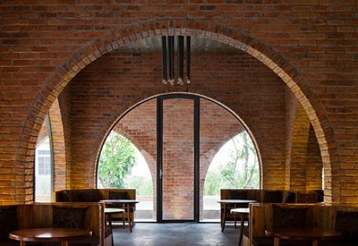 Проект этого Вьетнамского кафе под названием F Cafe разработан в соответствии с концепцией минимализма: кирпич, бетон, камень, живые деревья и вода вместе создают лаконичное и эмоциональное пространство. Прямоугольное здание, придуманное архитекторами Wangstudio, включает в себя 24 больших арочных проема во внешних и внутренних стенах. Сетка стен делит здание на две части. Снаружи находится крытая терраса со столами и стульями, а внутри – основное помещение кафе. Арки, отделяющие террасу от кафе, остеклены. В каждой из них имеется дверь, что позволяет проветривать салон. Вдоль южного и восточного краев здания дизайнеры запроектировали отражающий бассейн, который также способствует охлаждению помещения. Кирпичные арки напоминают посетителям ворота старинных замков и деревень Вьетнама.