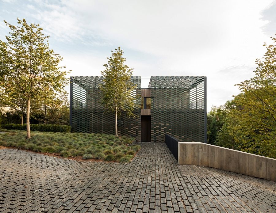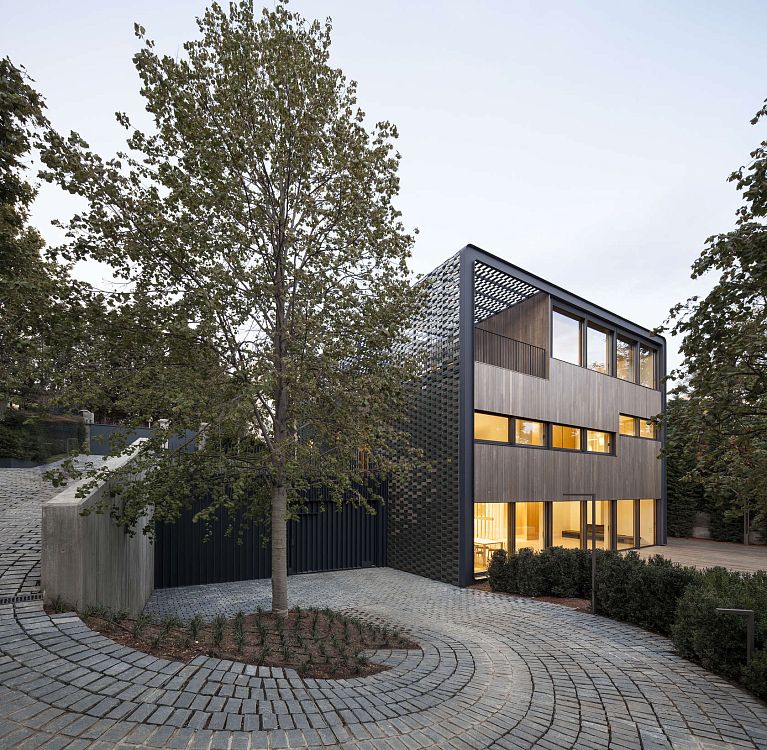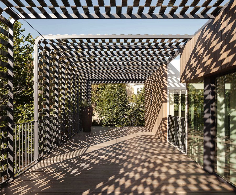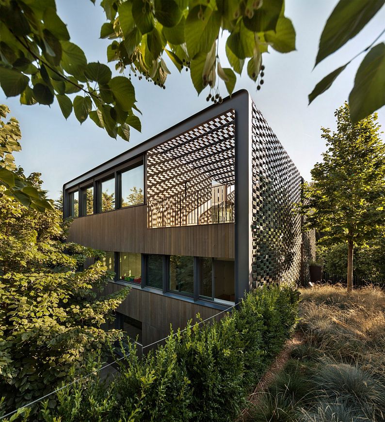 Верхний этаж находится на одном уровне с городом, в то время как нижние два обеспечивают умиротворяющий вид на природный ручей. Интересная особенность проекта – это экран из керамических плиток, которые позволяют регулировать интенсивность освещения. Эта структура объединяет функции фасада, кровли и перголы. Благодаря такому подходу заказчики могут взаимодействовать со средой, сохраняя неприкосновенность частной жизни.