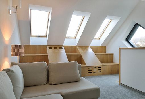 На окраине Вольского леса, к западу от Кракова, польский архитектор Тадеуш Лемански создал жилой дом необычной формы. Свой проект он назвал Domo Dom. Чтобы уместить жилую часть и гараж на небольшомпятне застройки, автору пришлось часть жилого объема резко «загнуть» вверх.Основные помещения – кухня, спальня и гостиная – расположены внутри простого куба, а спальня поднята над «врезанным» объемом гаража. Три окна на крыше пропускают внутрь дома дневной свет.Чтобы здание органично вписалось в окружающий пейзаж, архитектор использовал традиционные материалы: серый песчаник и черные титан-цинковые панели для наружной облицовки. Их контрастные оттенки также усиливают разделение между жилыми помещениями и гаражом.Чтобы подчеркнуть динамизм постройки, боковые окна были «выгнуты» в том же направлении, что и вся конструкция. С обратной стороны установлены стеклянные раздвижные двери, сквозь которые видны терраса и газон.