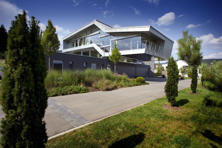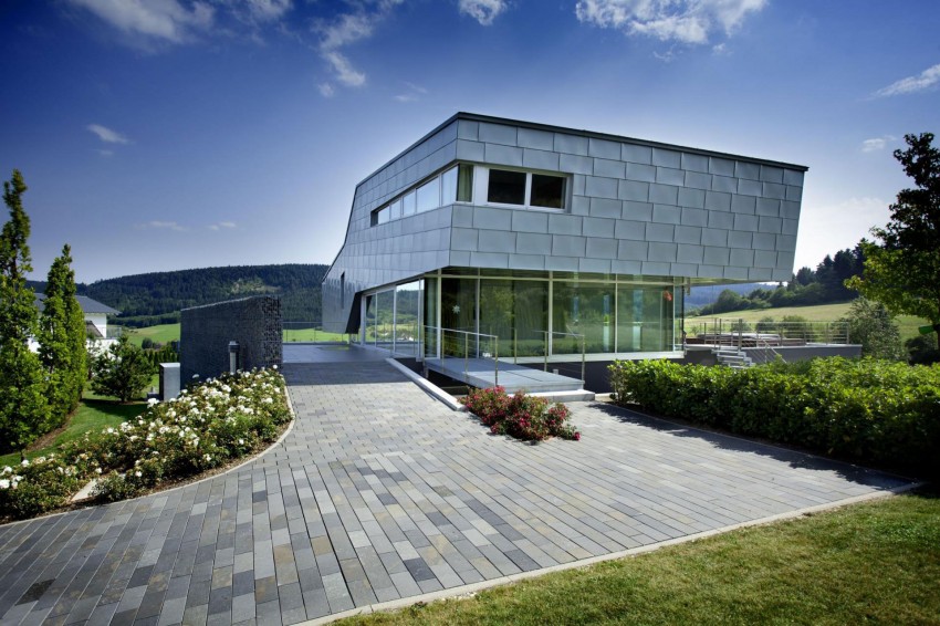 Изначально запланированное в традиционном стиле сооружение после длительного общения с Харальдом Эпплером (Eppler + Bühler) приняло вид консольного многогранного объема ввысокотехнологичной формы, расположенного на прямоугольном основании. Выбранные материалы и технологическое оснащение соответствуют передовым тенденциям архитектуры: металл, композиты, встроенная техника, автоматизация. Строительство продолжалось 2 года, а разработка – 5.