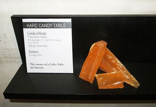 «Какой должна быть мебель периода экономического кризиса? – задались вопросом дизайнеры Lanzavecchia + Wai. – Она должна быть ...съедобной!»  Сначала эти вещи используешь по функциональному назначению, любуешься на них, а в трудные времена – съедаешь. На выставке Foodmade дуэт показал симпатичный стол со столешницей из прозрачной карамели. Он входит в коллекцию Austerity, которая также включает еще три концепта: стол из галет, стул из шоколада и диван из брикетов риса. Все модели можно постепенно подъедать до полного обнажения металлического каркаса.