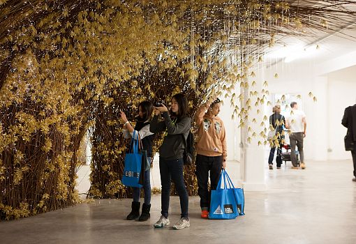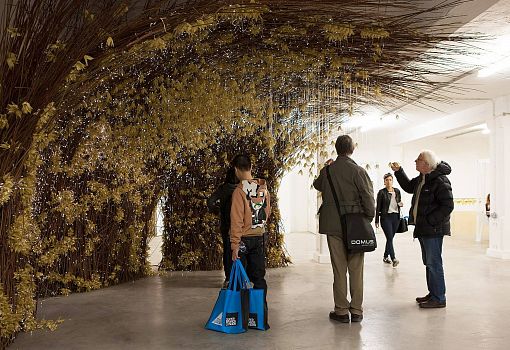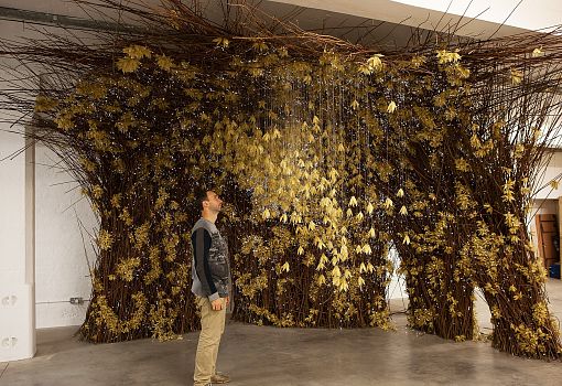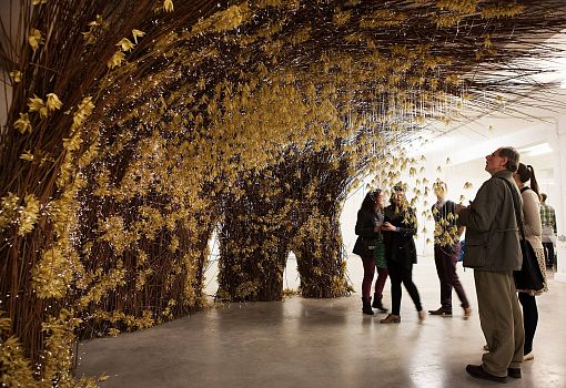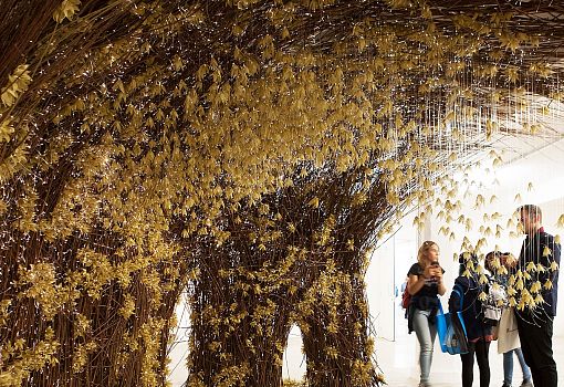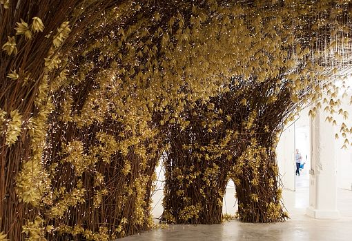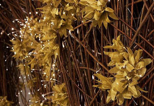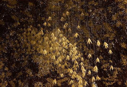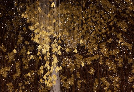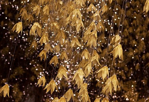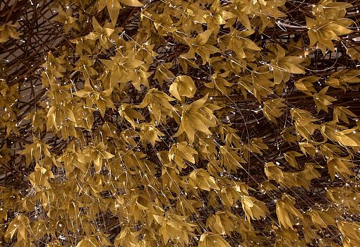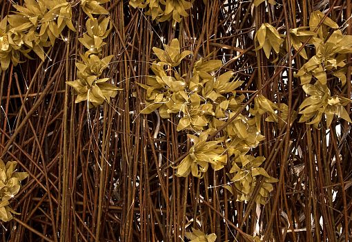 Вплетенные в прутья нежные трепетные цветы (а их больше 10 000)  сделаны — хоть в это и трудно сразу поверить — из меди, точнее, из тонкой тканой медной сетки. Характерное ощущение воздушности и «сказочности» инсталляции придает подсветка — россыпь оптоволоконных нитей торцевого свечения.