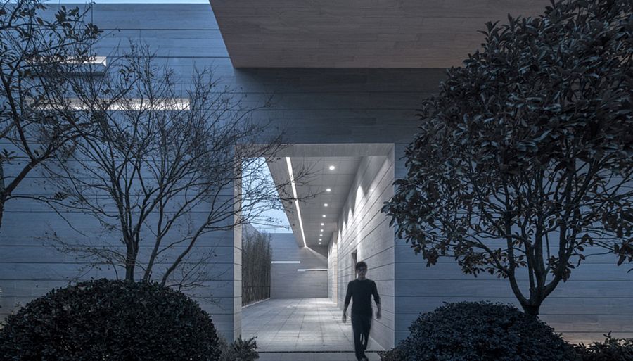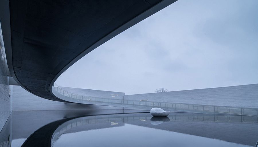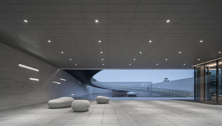 Постройка удачно вписана в ландшафт, что дало критикам право говорить о ней, как о детали, связывающей город с природой. И действительно, здание галереи представляется как портал в парк, зеленую часть Наньчана, отсеченную от района небоскребов развязками автомобильных шоссе. Основной архитектурный элемент, основа композиции, - узкий прямоугольный объем с внутренним двором, окруженным бетонными стенами. Точки входа в здание – остекленный вестибюль на первом этаже и скругленная рампа, опирающаяся на три стены внутреннего двора. Она ведет на второй этаж галереи, где располагается зона рецепции и несколько экспозиционных залов. Мост нависает над гладью искусственного пруда, в которой отражается эта изящная конструкция. Остается добавить, что фасады здания и все поверхности внутреннего двора вымощены узорчатой каменной плиткой светло-серого цвета, гармонирующего с окружающей средой.
