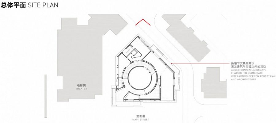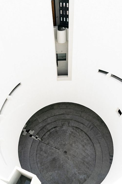 На цокольном этаже запроектированы кафе, многофункциональная галерея и открытый амфитеатр. Спиральная рампа большого диаметра ведет отсюда наверх, сквозь пять разнохарактерных выставочных пространств прямо на крышу, откуда открывается панорамный вид на город. Многофункциональную галерею и амфитеатр со световым люком можно назвать центральными помещениями арт-центра.