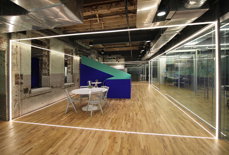 Последний элемент окрашен в бирюзовый цвет и служит для отделения функциональных зон от служебных помещений снизу до террасы верхнего этажа. В оформлении интерьера большое значение имеет свет, с помощью которого архитекторы зонируют пространства и расставляют акценты. Общая площадь офиса 4366 кв.м.