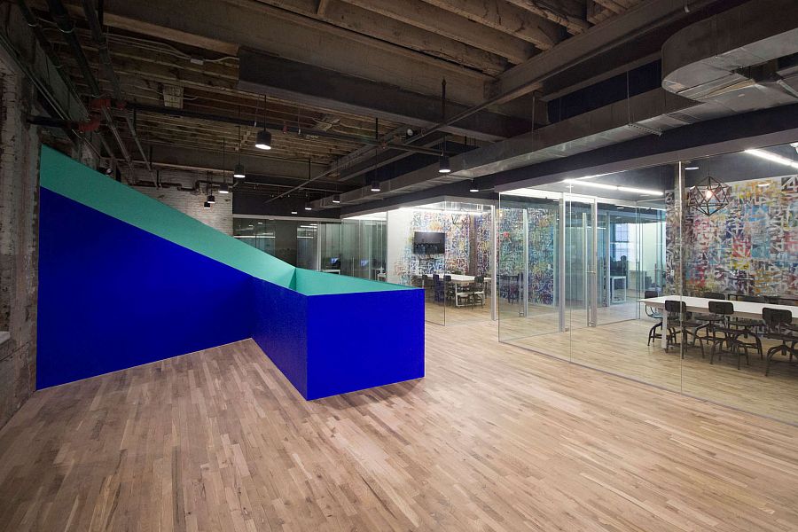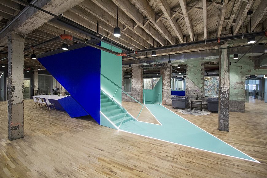 Промышленная стилистика стала основой проекта офиса одной компании, которым занимались архитекторы бюро Leeser Architecture. Оставленные без отделки элементы – несущие конструкции и коммуникации – контрастируют с тщательно обработанной древесиной и «оригами» лестницы.