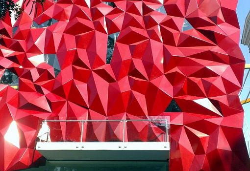 Тематический фасад для одного ювелирного магазина спроектировали архитекторы бюро Onus Design. Модульные панели здания из листового алюминия напоминают грани рубина. Скульптурные формы стали не только привлекать клиентов, но и позволили зданию стать городским ориентиром.